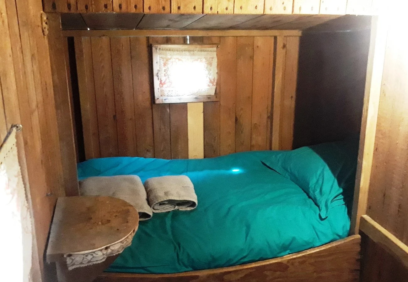 Il possède un coin assis avec deux banquettes et différents espaces de rangement (placards, étagères). Reliée à l’électricité, vous disposez d’une applique pour l’éclairage et d’une prise.