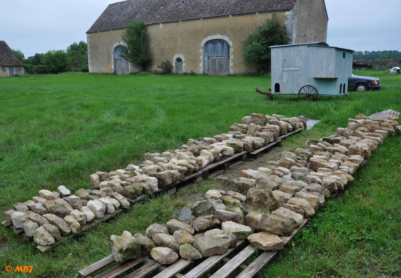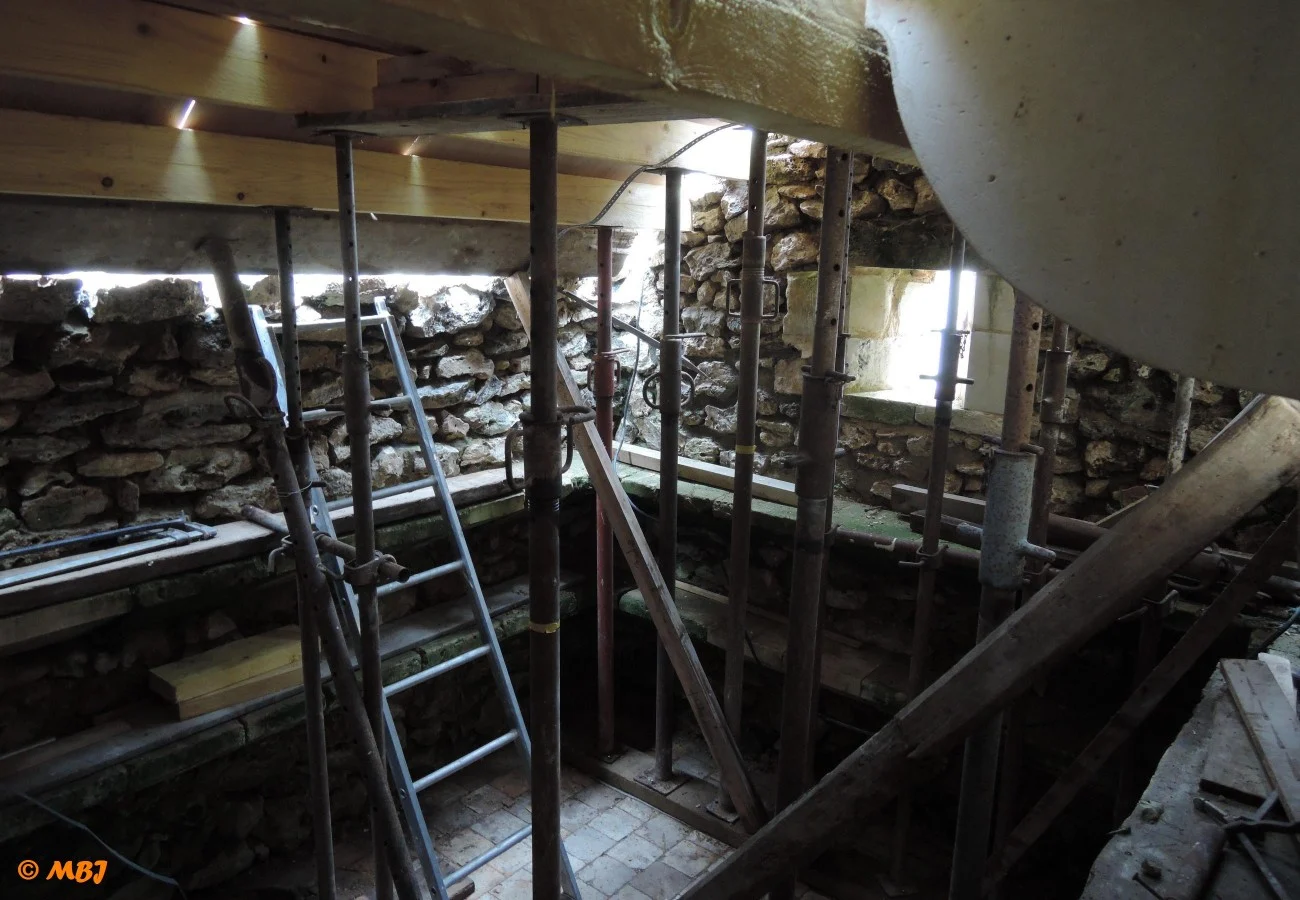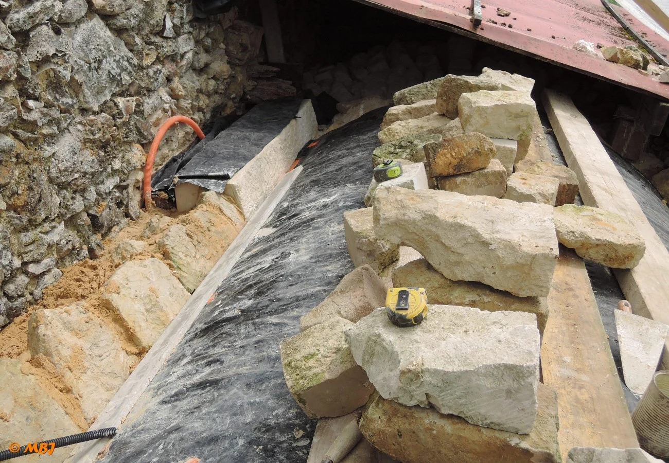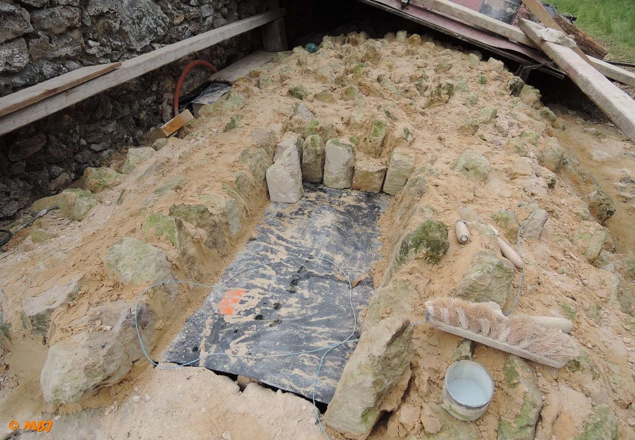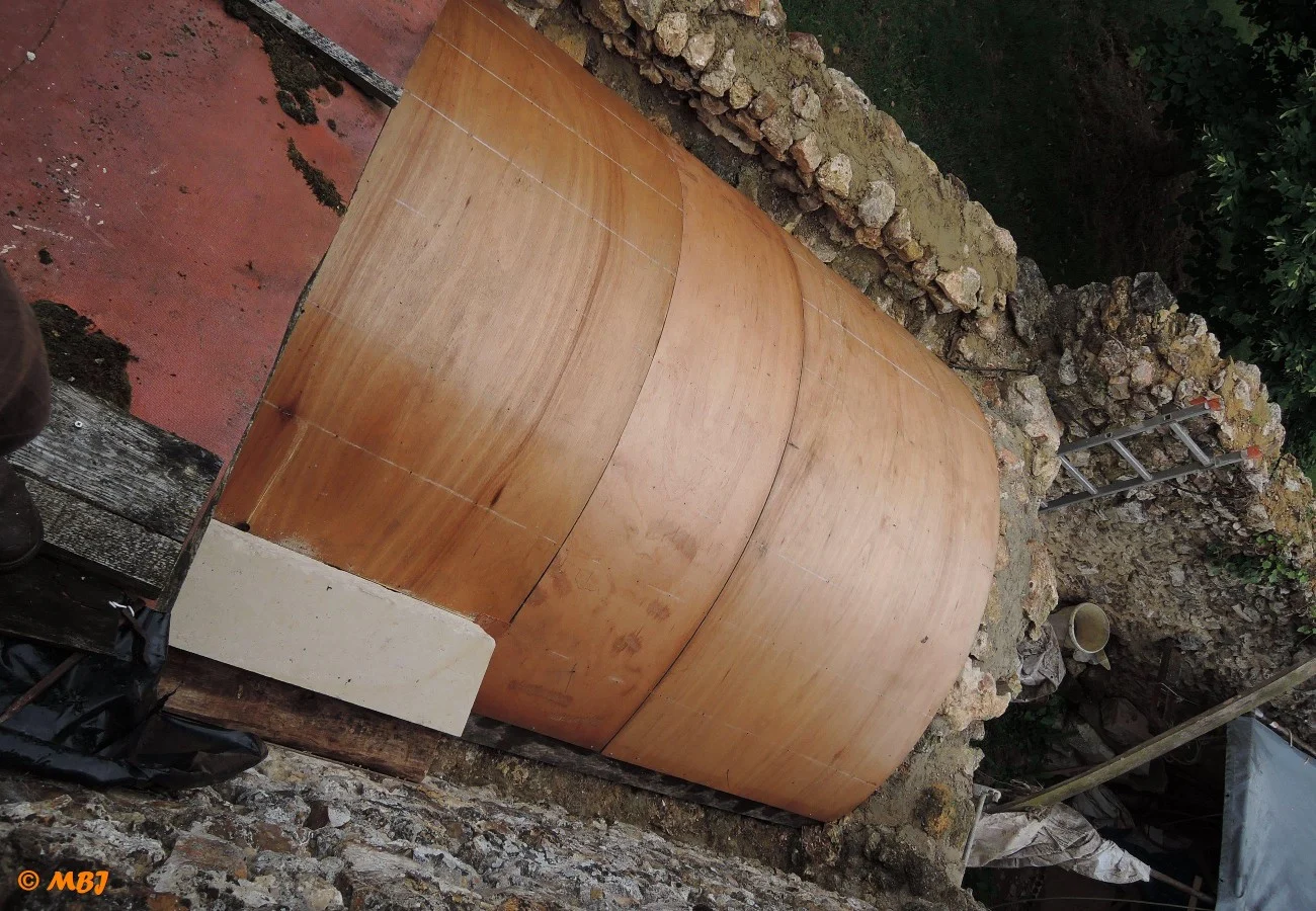 En 2016, après avoir remonté les murs de la cave, nous reconstruisons sa voûte. L’emplacement dans le mur est encore visible pour retrouver ses proportions. Le moule est fait à partir de plaques de contre-plaqués fins et humidifiés. Une « charpente » est montée en dessous à partir d’une douzaine de bastaings.