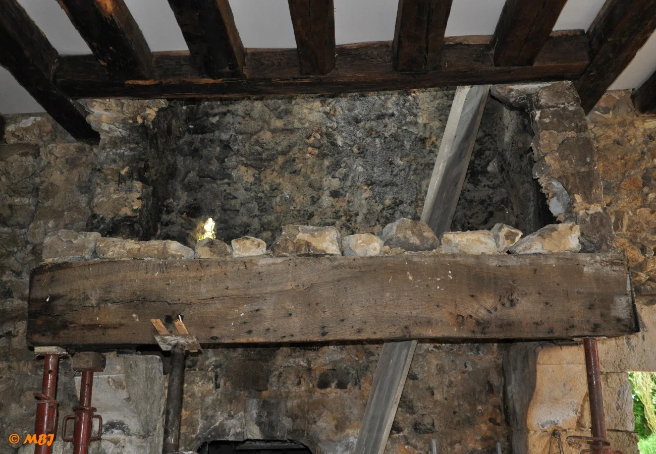 La cheminée du fournil est en très mauvais état à notre arrivée en 1985. Comme le four à pain, la hotte est pratiquement écroulée. En 1999, la tempête n’arrange pas les choses… Le vent s’y engouffre et détruit une partie de la cheminée en pignon du bâtiment. Avec les vibrations, l’arc de décharge (voûte sur la hotte) ne fait plus son travail, les pierres tombent progressivement.