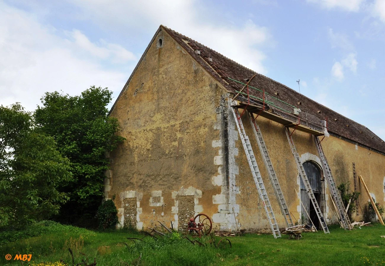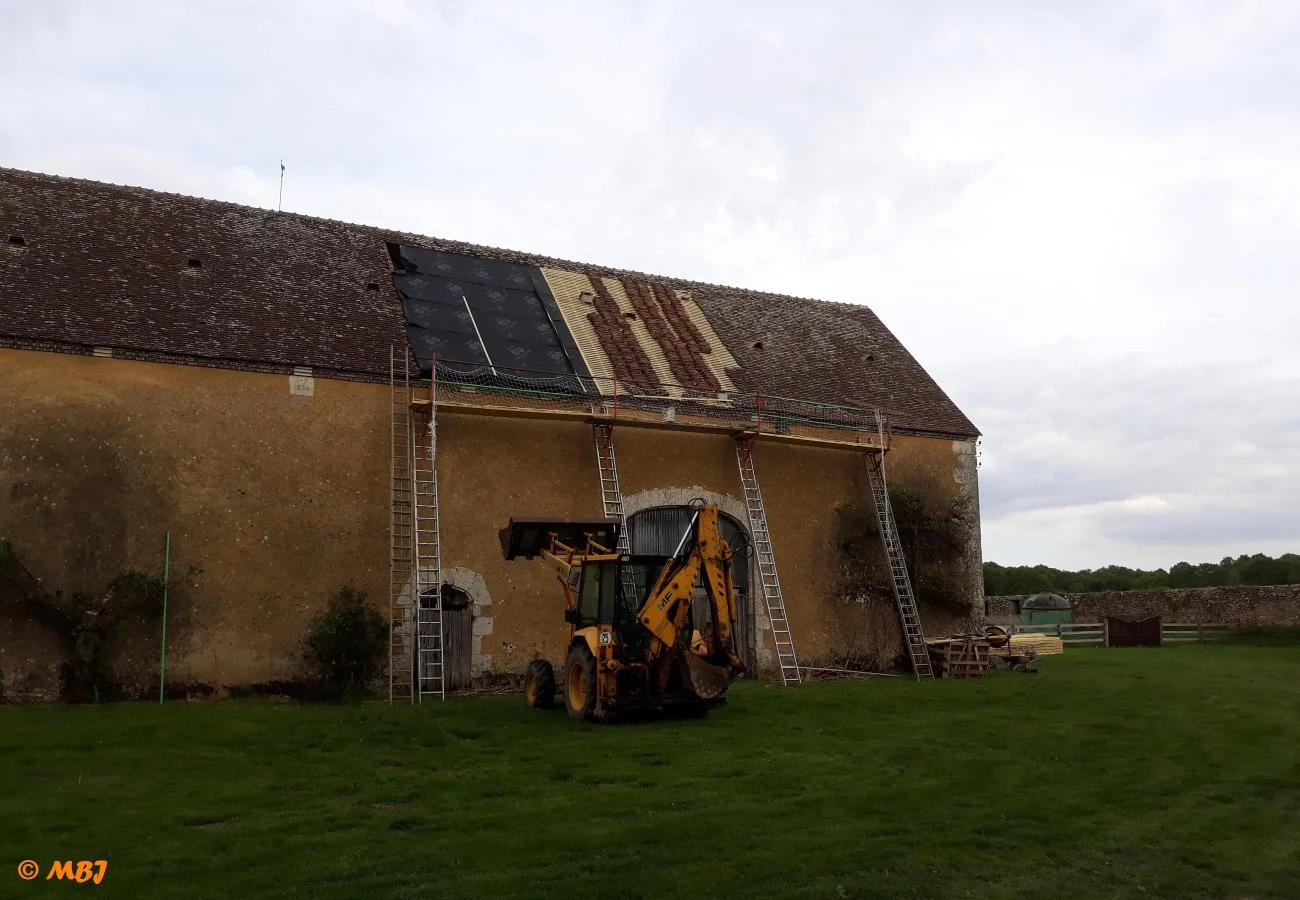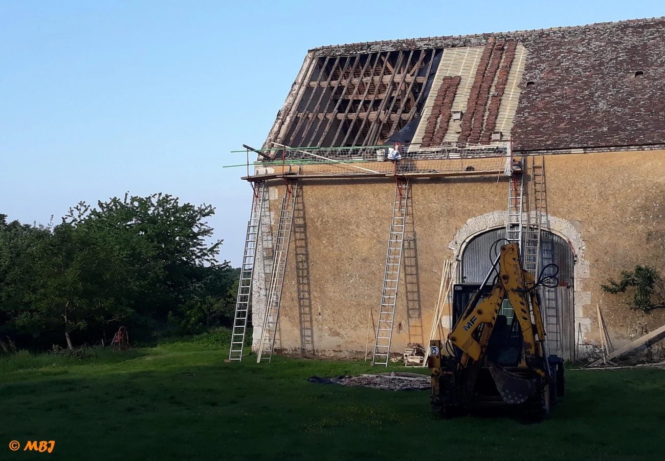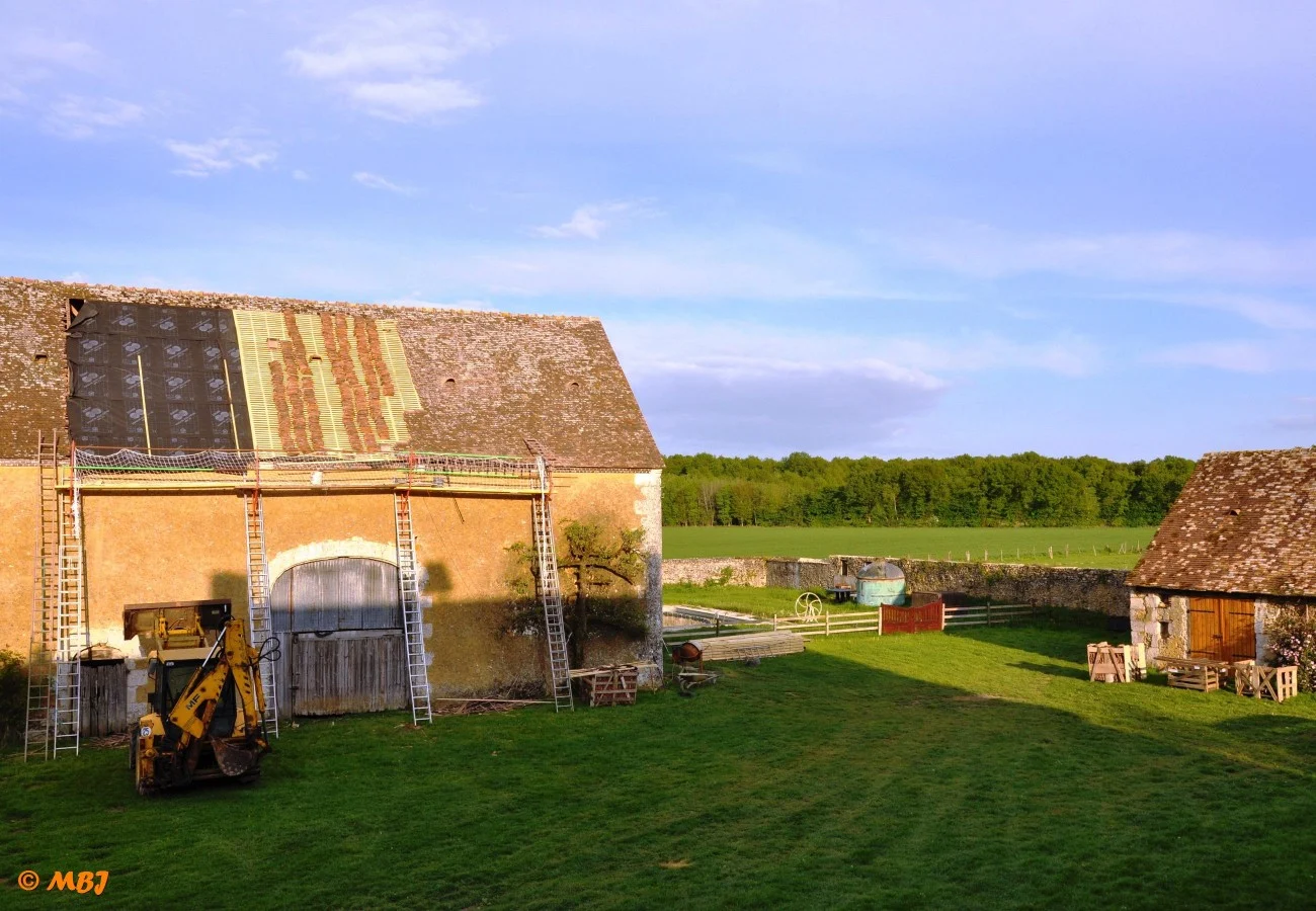Au printemps 2018, l’ensemble de la toiture de la grange côté cour a été refaite. C’est la seule qui n’avait jamais été restaurée depuis notre arrivée en 1985. Près de 300 m2 de tuiles ont été posées, la plupart étant d’origine.
