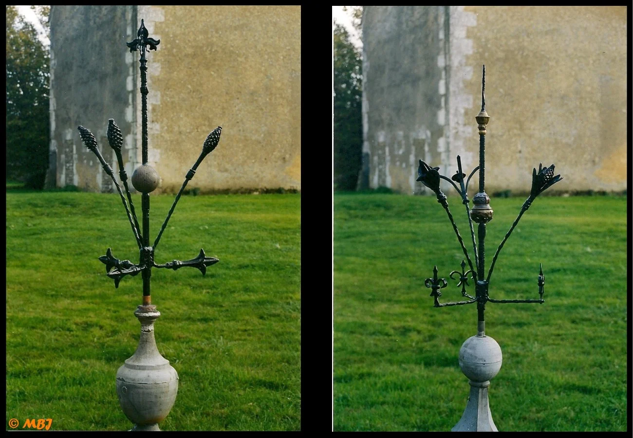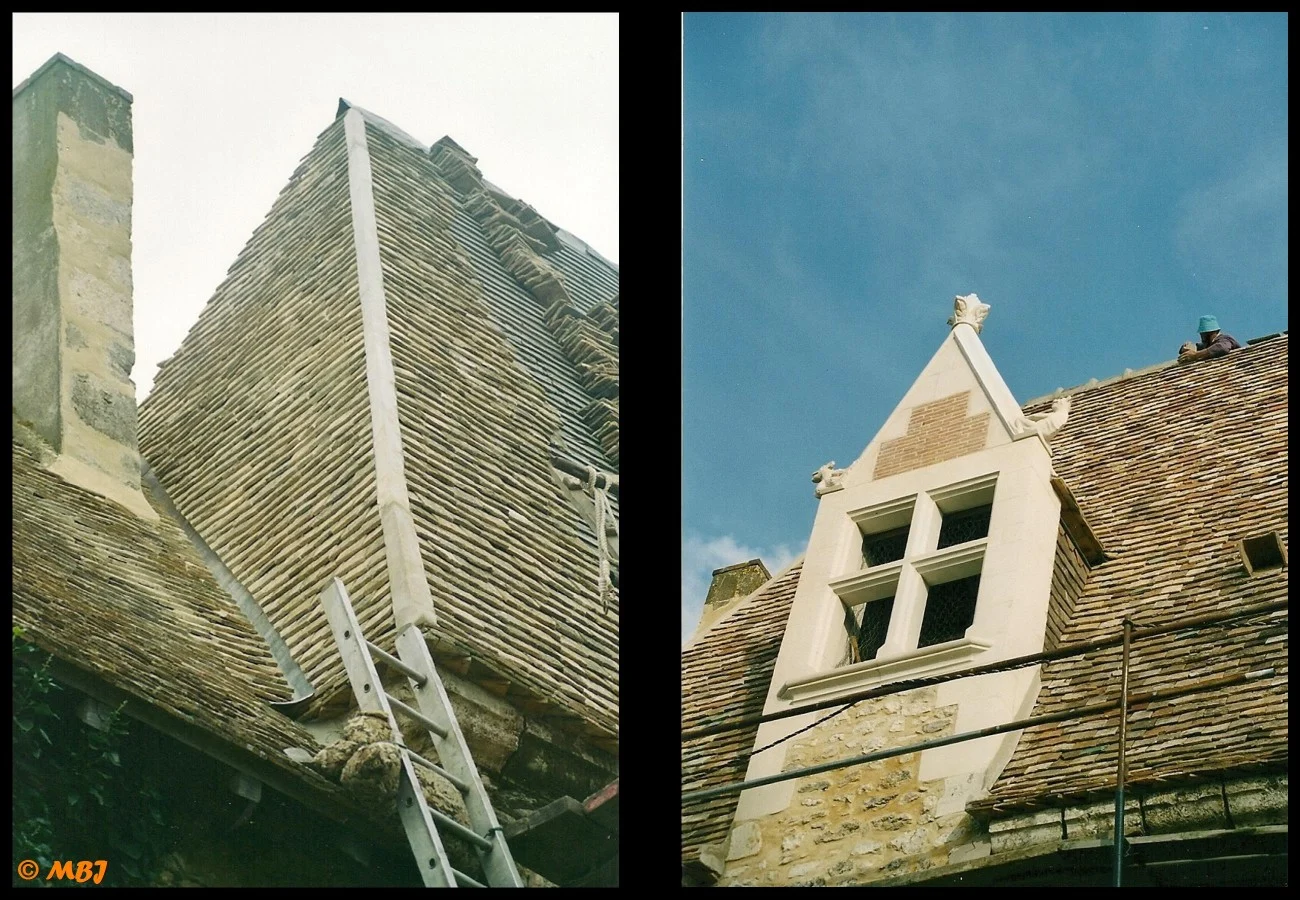 En 2002, après le remontage de la charpente de la tour, l’ensemble de la couverture a été restaurée. Nous avons utilisé des lattes en chêne comme à l’origine. Quelques tuiles d’origine ont été réutilisées, mais la plupart proviennent de lots achetés depuis 1986 dans différentes fermes du Perche. Compte-tenu de la pente de toit importante et des risques de tempête, le tiers des tuiles a été cloué. Des épis de faîtage en métal ont étés réalisés pour l’occasion pour dominer la bâtisse…