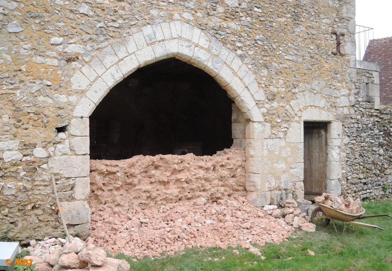 En 2002, après avoir remonté la charpente de la « Tour », nous avons commencé à déboucher ce porche qui donne sur l’extérieur. Hésitant à l’ouvrir totalement, le chantier a été arrêté en attendant la fabrication de grandes portes en chêne. Plusieurs années plus tard, en 2016, après quelques siècles d’obscurité, nous avons décidé de finir de l’ouvrir. C’est alors que la découverte fut faite d’anciens passages d’une herse en bois ! L’aspect semi défensif du lieu est indéniable. Nous projetons donc de la reconstruire prochainement, à l’image d’autres édifices. Il est aussi prévu de rouvrir le porche de l’autre côté qui donne sur la cour…