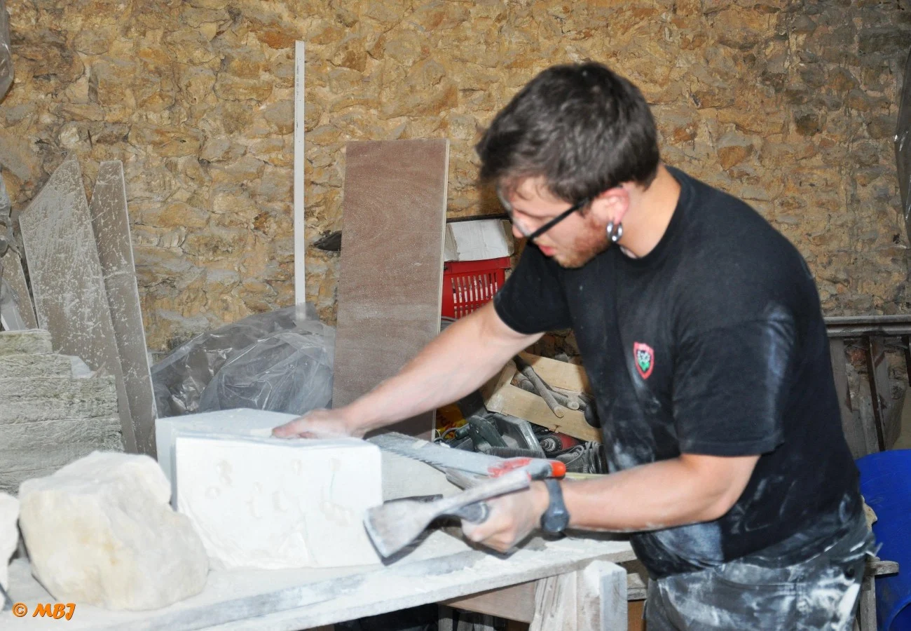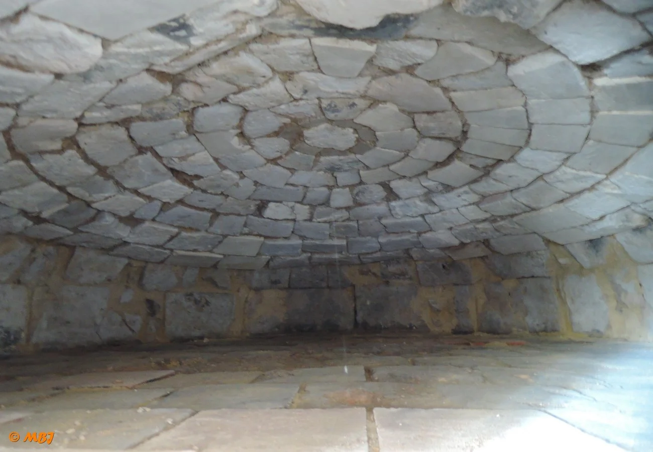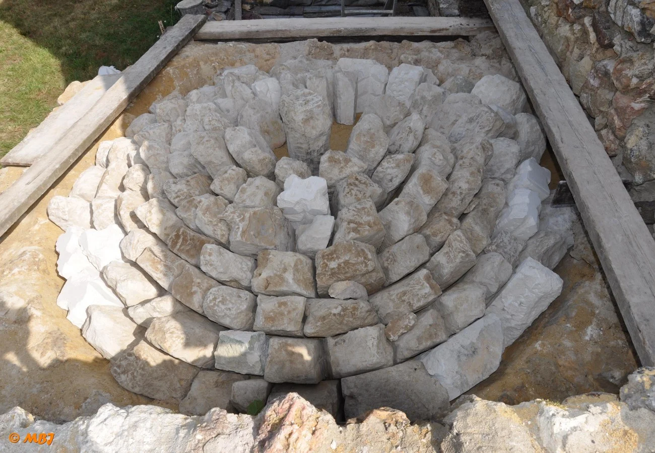 La première étape est alors de démonter les pierres, les numéroter, et d’en faire un cercle au sol. Ensuite, nous retaillons environ 1/3 des pierres, soit une trentaine de blocs. Les plus abîmées sont remplacées. Cela reste par contre complexe du fait de la forme en dôme de l’ensemble, chaque pierre est taillée en fonction de sa place dans un cercle et vis-à-vis des autres cercles. L’ouvrage est en trois dimensions, contrairement à une voûte traditionnelle. Plusieurs cercles concentriques s’articulent autour d’une pierre centrale, la clé de voûte. La sole est par contre en bonne état.