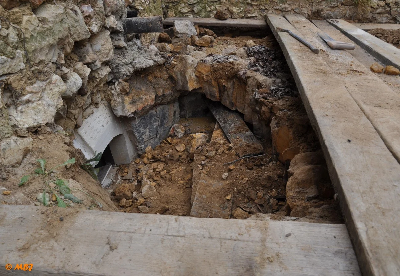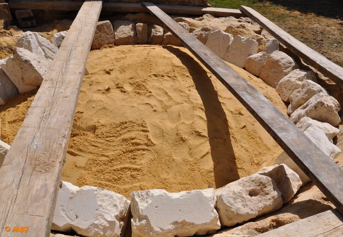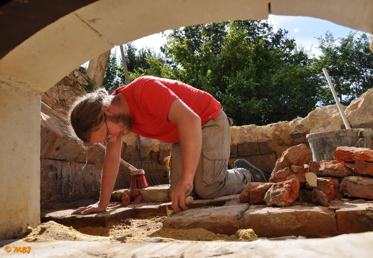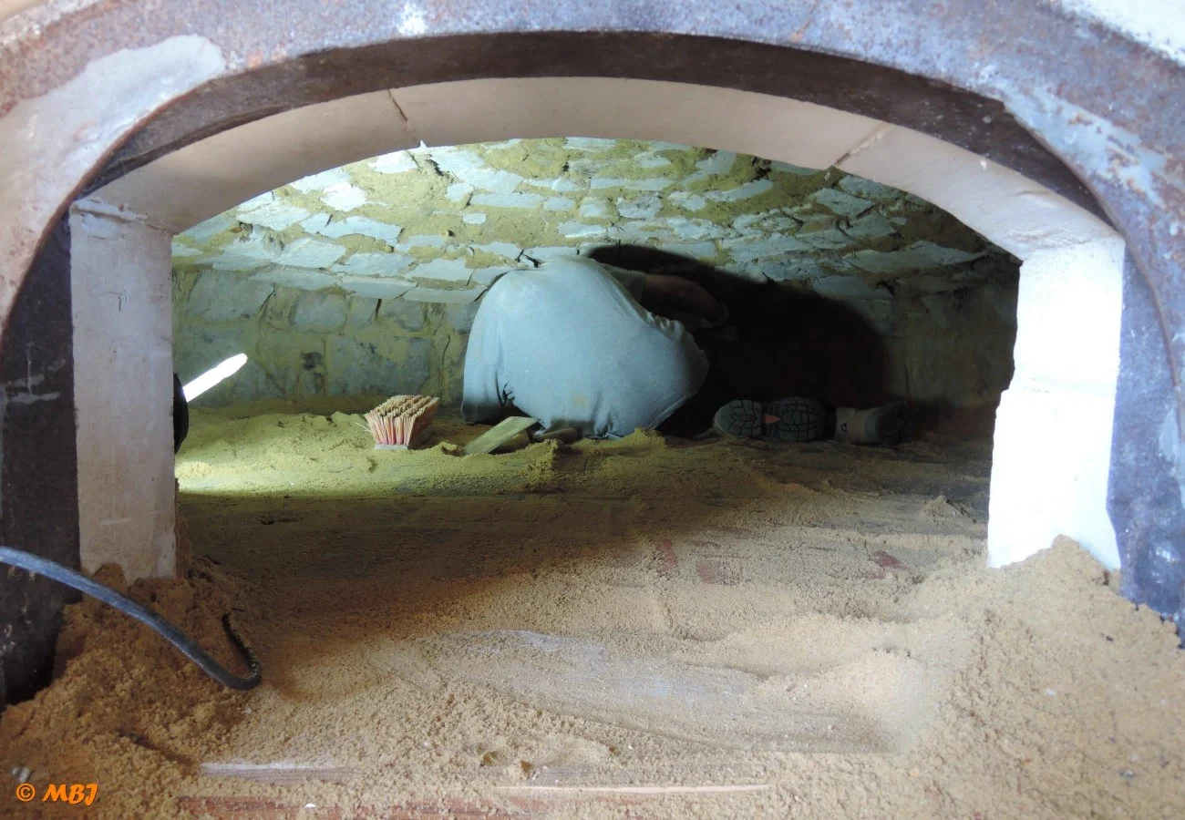 Pour remonter cette voûte, le principe est plutôt logique. Il faut faire un tas de sable en forme de dôme et monter les pierres dessus. Le liant est un mélange d’argile malaxé longuement et rincé à l’eau dans une bétonnière, on y ajoute ¼ de sable et un peu de foin. Il n’y a par contre pas de chaux, cette matière ne résistant pas à la chaleur. Le tout est ensuite coulé entre les pierres après un séchage de plusieurs mois. Nous avons finalement pelleté le sable par l’ouverture intérieure.