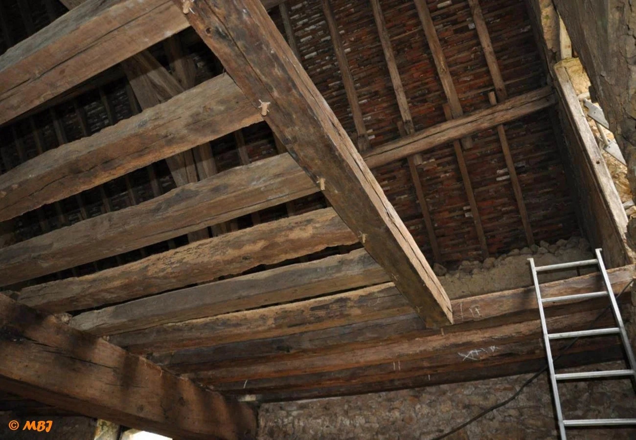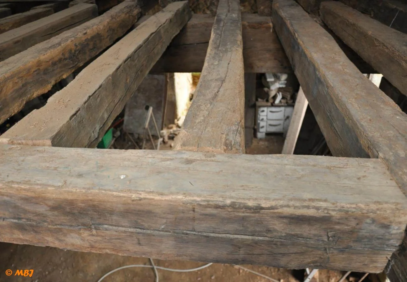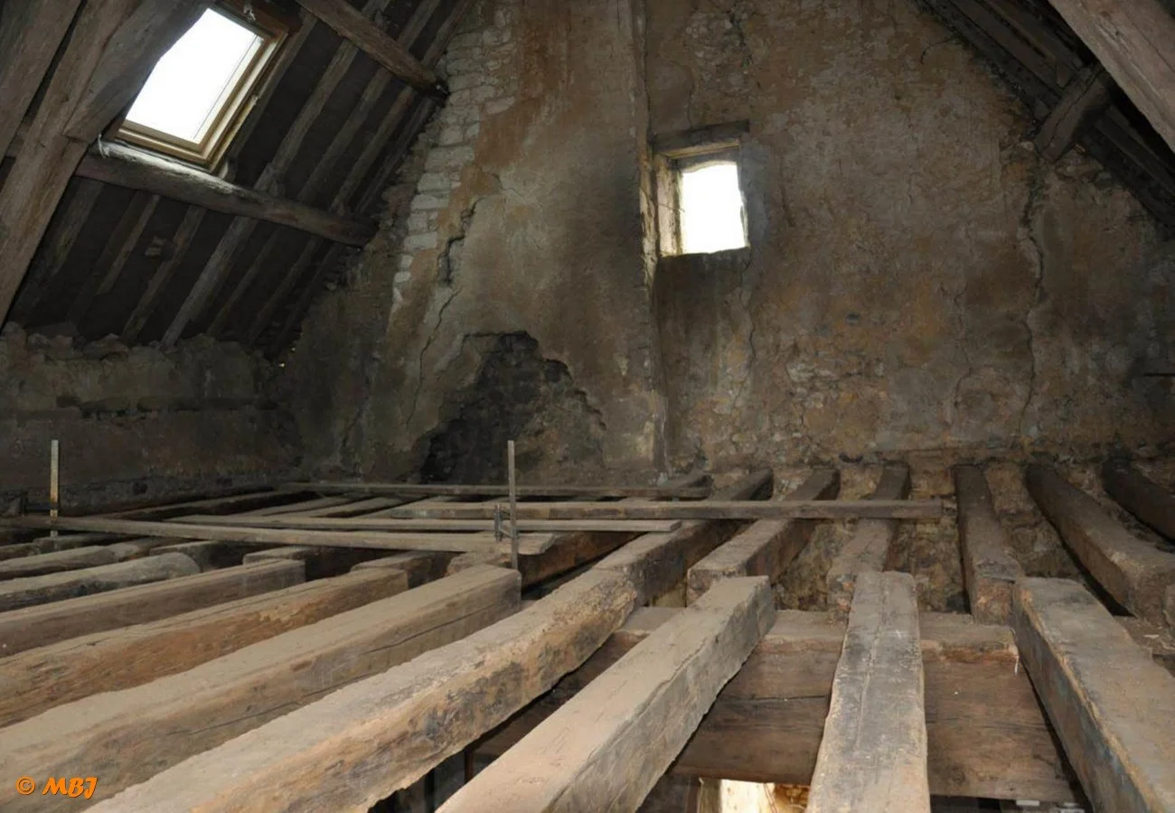 Abîmés par l’humidité et les infiltrations d’eau, les planchers du fournil ont dû être démontés. Les anciennes entre-solives, en bauge (mélange de terre, d’argile et de paille), ne supportent pas l’humidité. Seuls les solives en chêne sont sauvegardés, en dehors de certaines vermoulues. Après avoir posé de grandes plaques de bois peint sur le solivage, une dalle de béton léger est coulée pour isoler le bâtiment et le consolider.