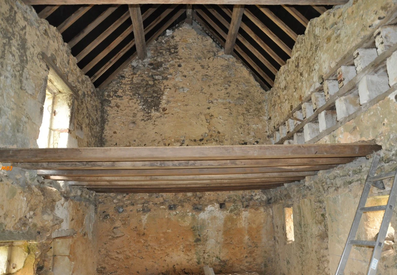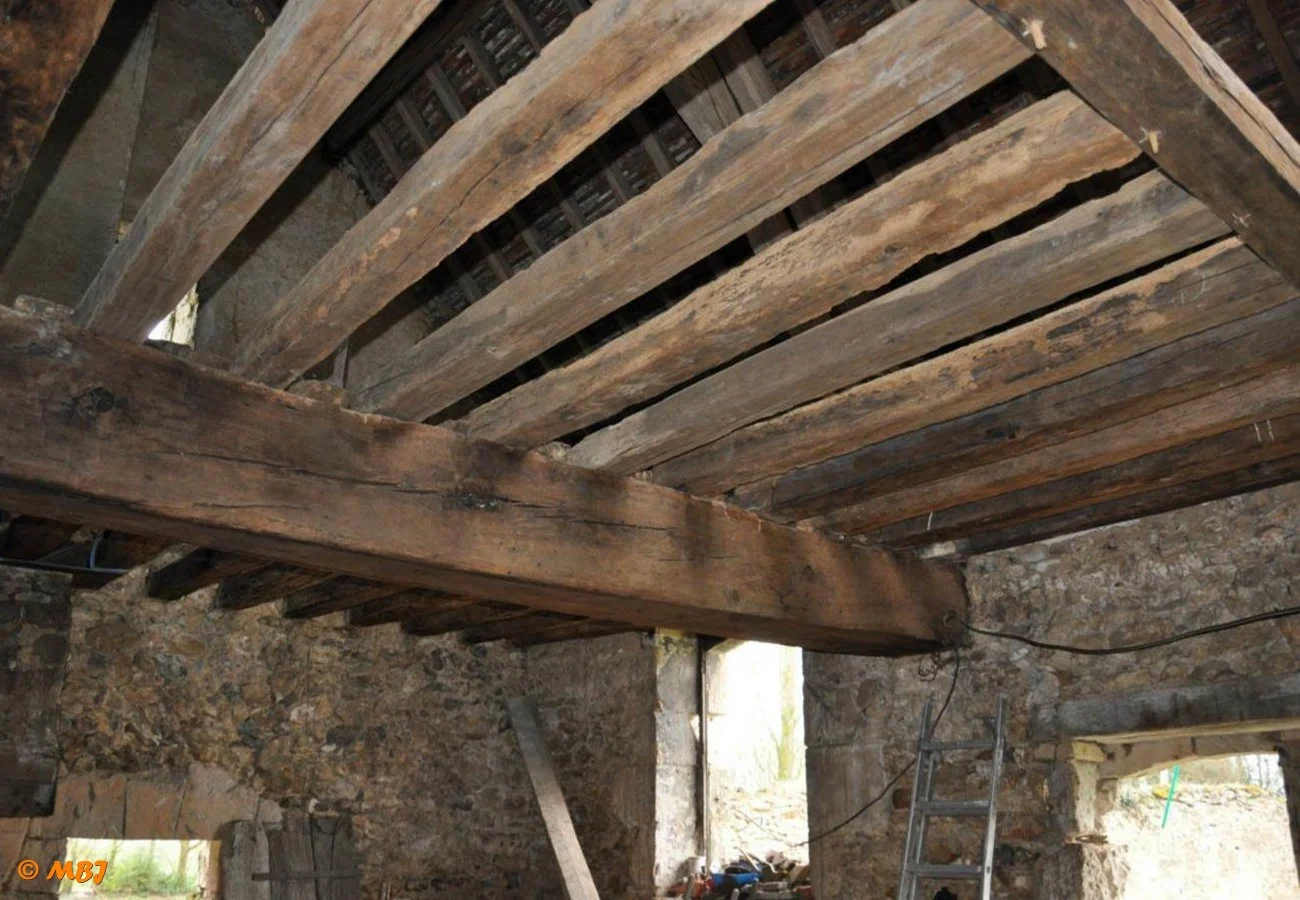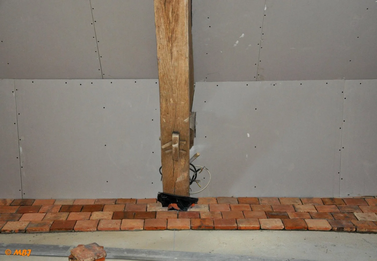 Abîmés par l’humidité et les infiltrations d’eau, les planchers du fournil ont dû être démontés. Les anciennes entre-solives, en bauge (mélange de terre, d’argile et de paille), ne supportent pas l’humidité. Seuls les solives en chêne sont sauvegardés, en dehors de certaines vermoulues. Après avoir posé de grandes plaques de bois peint sur le solivage, une dalle de béton léger est coulée pour isoler le bâtiment et le consolider.