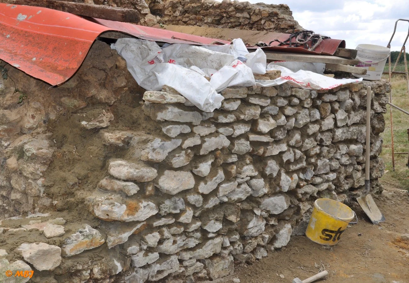 Les murs sont progressivement remontés en silex, comme à l’origine, à partir de 2010. Les étagères en pierres sont restaurées ou retaillés. Cet ouvrage doit être solide, il accueillera en 2016 de nouvelles voûtes…