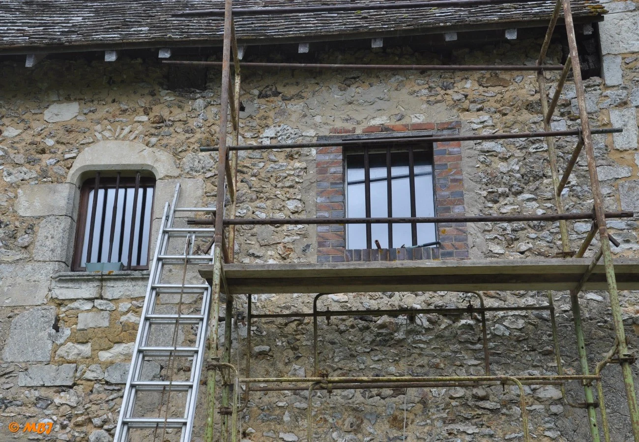 En nous basons sur la carte postale de 1905, nous avons décidé en 2014 de remplacer cette ouverture par une fenêtre aux proportions d’origine, caractéristique du XVIème siècle. La chaux est un des matériaux de base en maçonnerie traditionnelle, d’autant plus dans le Perche. Nous l’utilisons exclusivement ici, comme dans l’ensemble des restaurations du manoir, avec différentes teintes de sable. Il nous faudra attendre quelques années pour que l’enduit se « patine » et s’harmonise avec le bâtiment.