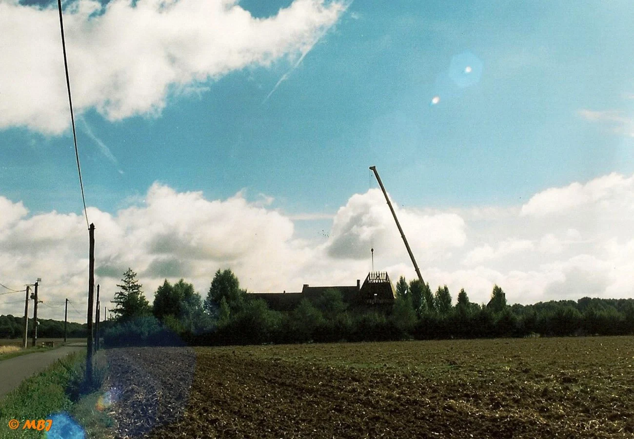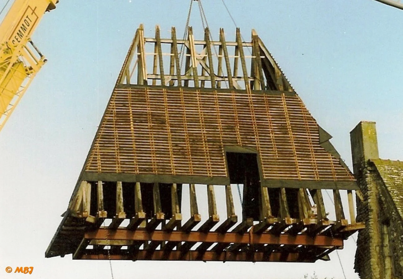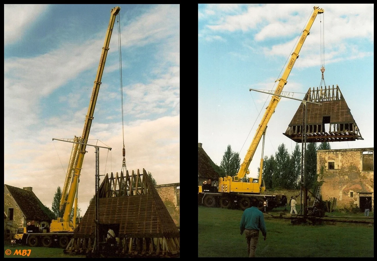 Après 15 ans de travail, un matin de septembre 2001, une grue automotrice fait son arrivée. L’ensemble de la charpente est alors monté au sol, à côté du bâtiment. Le camion grue la dépose en quelques minutes…