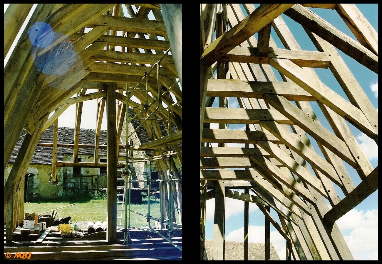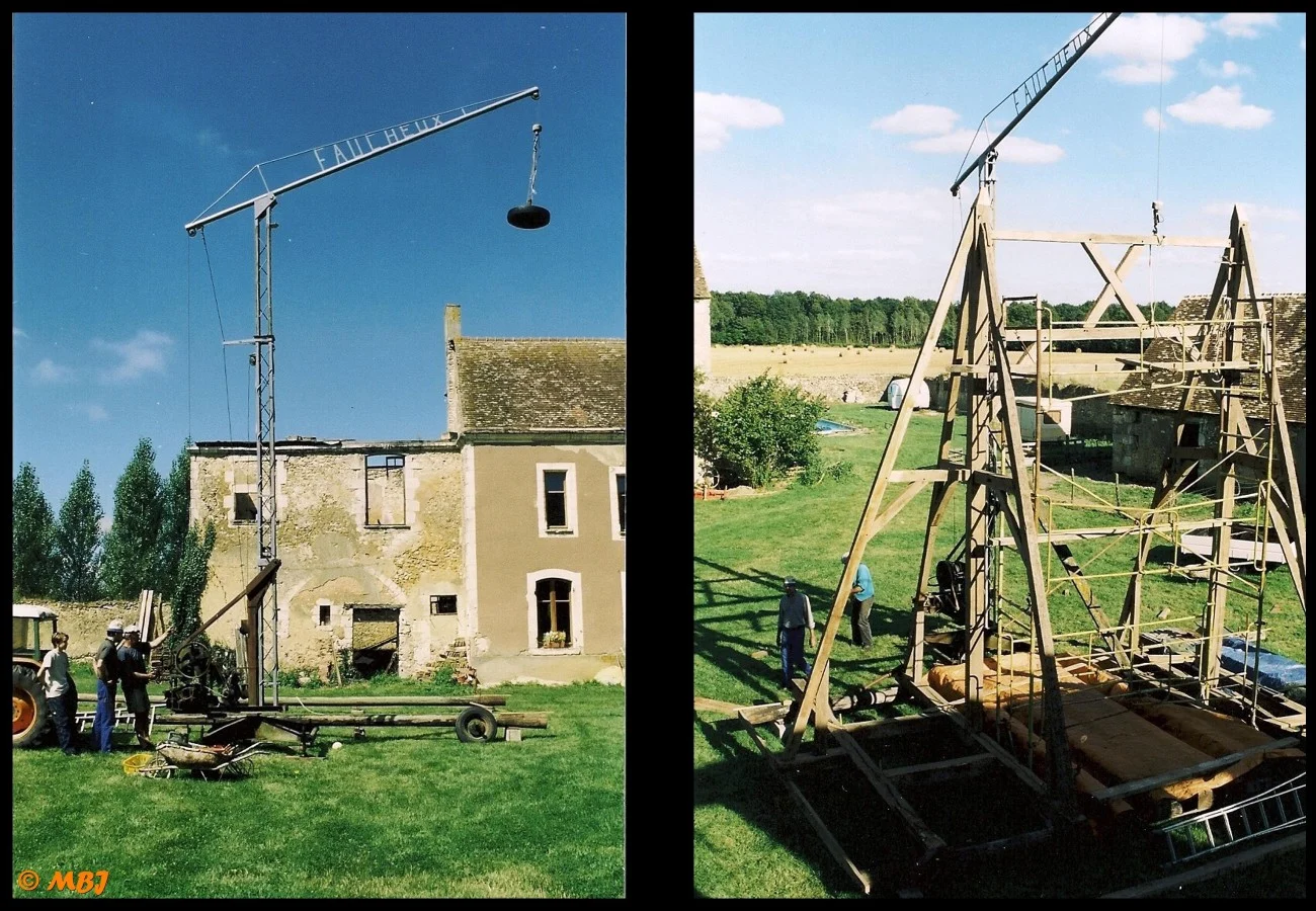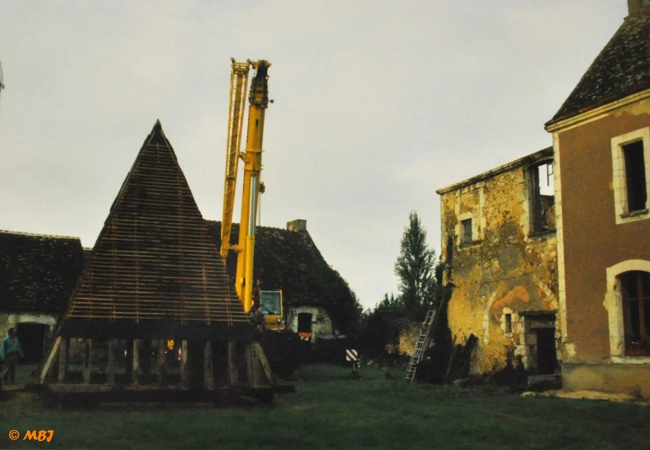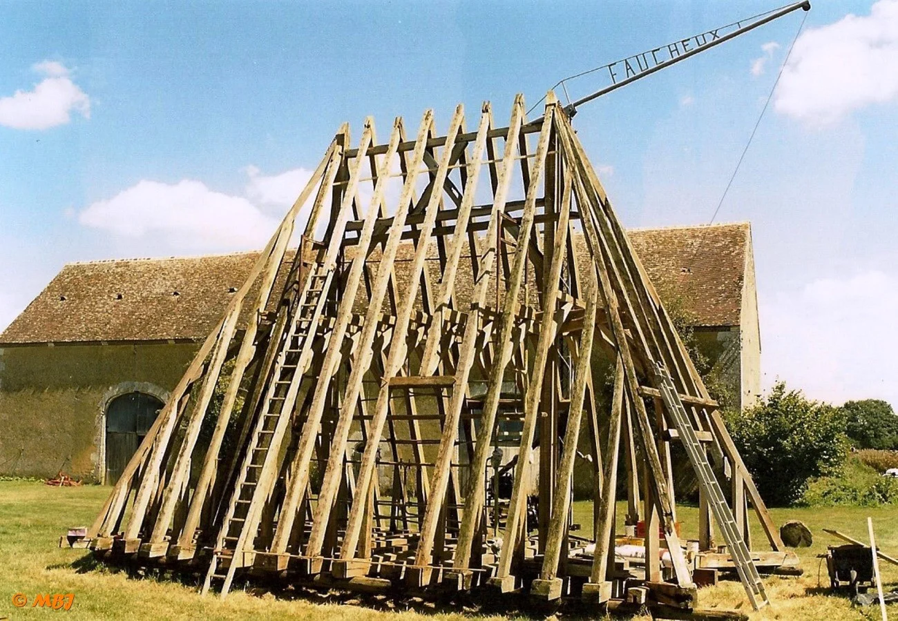 Après 15 ans de travail, un matin de septembre 2001, une grue automotrice fait son arrivée. L’ensemble de la charpente est alors monté au sol, à côté du bâtiment. Le camion grue la dépose en quelques minutes…